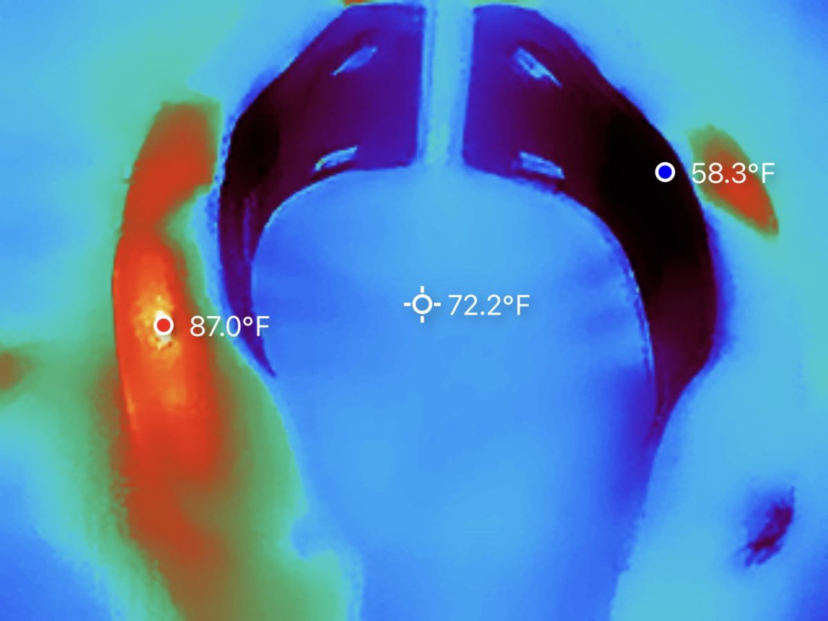 It does the basics much better than the cheaper models. The fans are significantly quieter (60 to 68 decibels) and the vents are much farther forward than the AICE Lite and Cyber, meaning that the air can be felt more directly on the cheeks and ears, which could be good or bad depending on wearer’s preference. Torras improved the cooling plates for 2025. In our 78 degree room, we measured the coldest point on the 2s as low as 64 degrees.