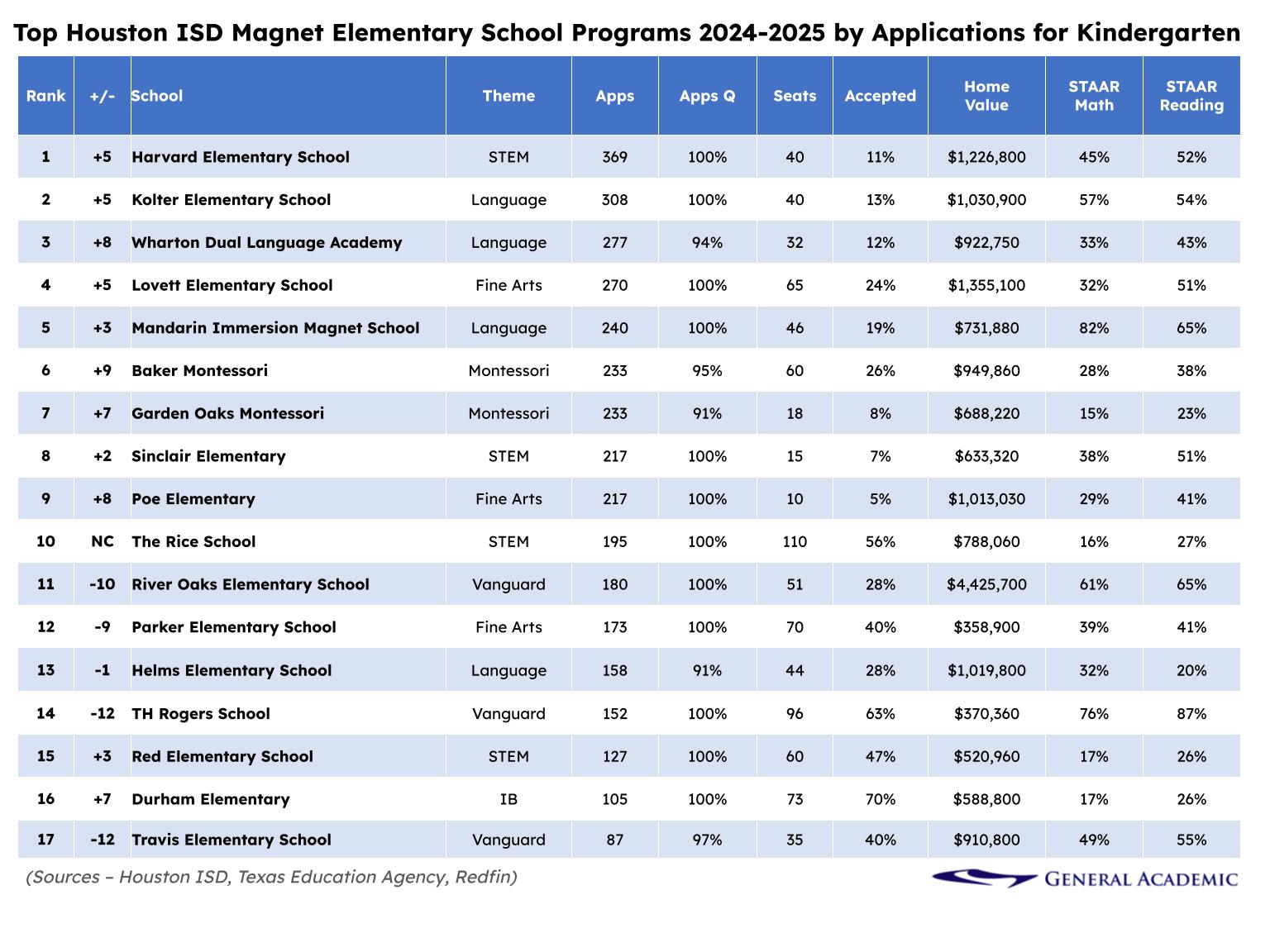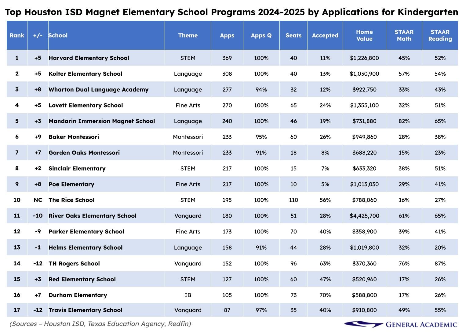 Harvard and Kolter Elementary Schools are the most popular by far, with applications jumping considerably by 116% and 105%, respectively, since our last analysis two years ago. The biggest surprise this year was Wharton Dual Language Academy which jumped considerably, jumping eight ranks in just two years*. Harvard, nestled in the Heights neighborhood, hosts a STEM magnet program; Kolter offers a foreign language magnet program in the Meyerland area; and Wharton (Montrose) nurtures bilingualism by enabling K-5 students to participate in the Spanish Dual Language Program and International Baccalaureate (IB) Primary Years Programme (PYP).