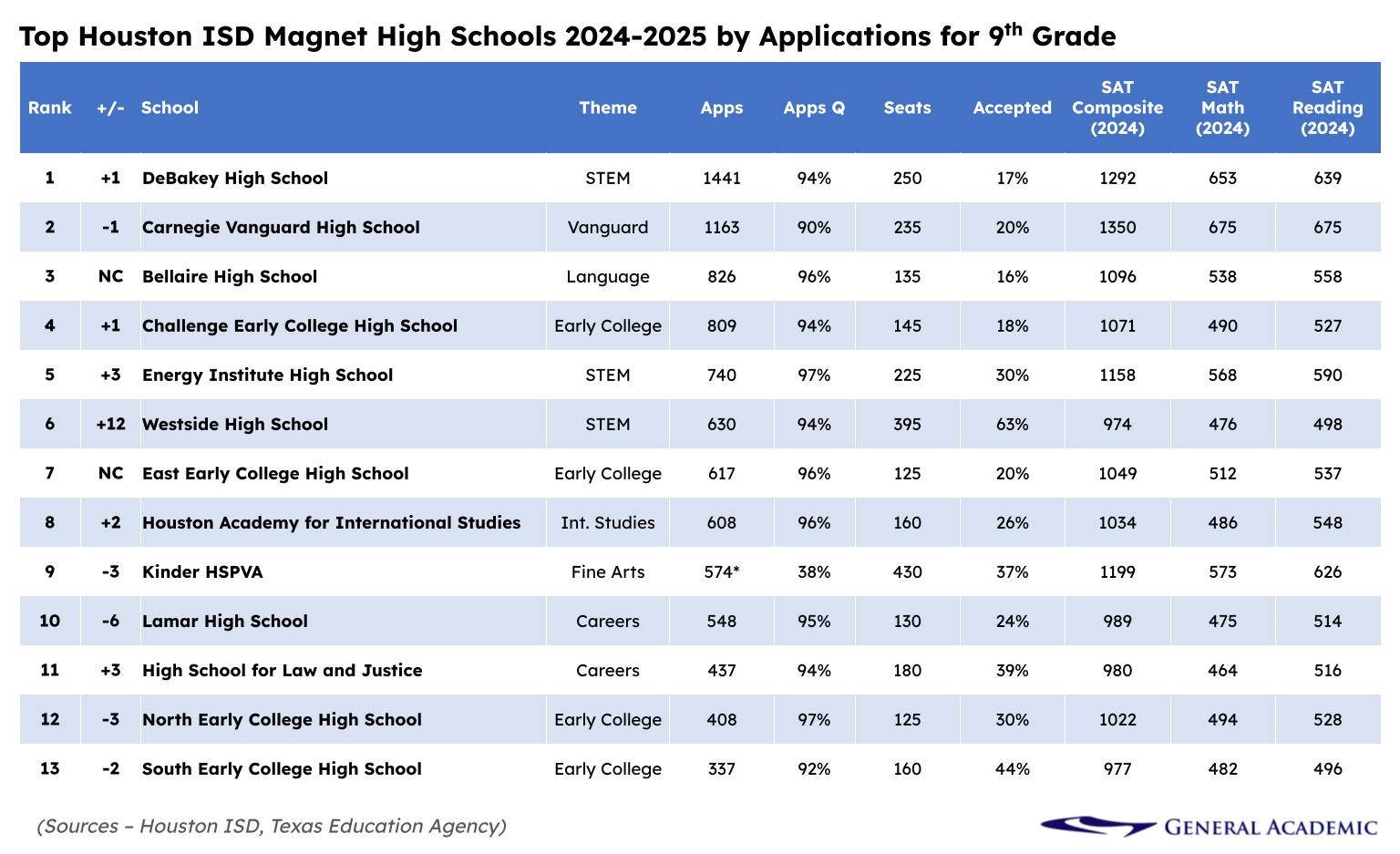 The analysis in this article is based on data General Academic obtained from HISD’s Public Information Office on August 11, 2025. Those data do not align with figures published by the Houston Chronicle. HISD has not responded to multiple requests for clarification. In January 2026, after submitting a second Texas Public Information Act request, HISD quoted General Academic a service fee for 50 hours of labor to reproduce records that had ostensibly already been provided. General Academic declined to pay this fee, and this article’s analysis is based off HISD’s original dataset from August 2025, which is more in line with the pre-takeover magnet data from the last decade versus what HISD recently provided to the Chronicle.