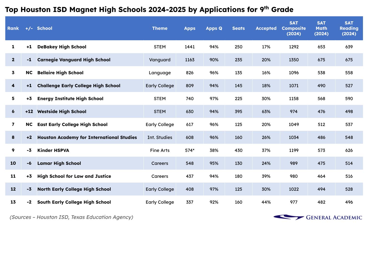 DeBakey and Carnegie Vanguard are HISD’s top high schools by applications, academic results, and national recognition. US News ranks DeBakey #75 and Carnegie #42 nationally. As such, it’s no surprise they’re so popular among Houston families. Both schools are great choices, and qualified students had around a 17% chance of getting into DeBakey in the Medical Center and 20% for Carnegie nestled in Fourth Ward.