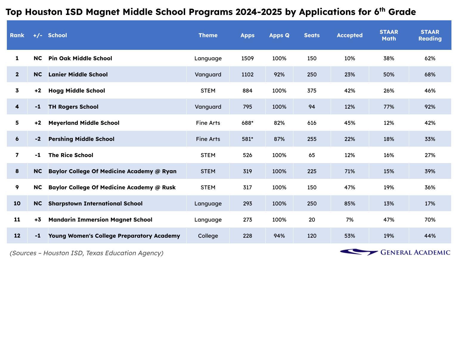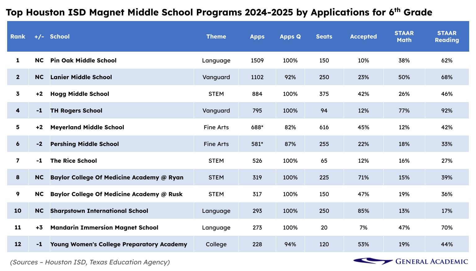 Pin Oak and Lanier remain the most popular middle schools in HISD. But TH Rogers, which used to hold the #3 spot, fell in popular ranking due to the large increase in applications for Hogg. However, TH Rogers is still #1 when it comes to its students’ STAAR performance.